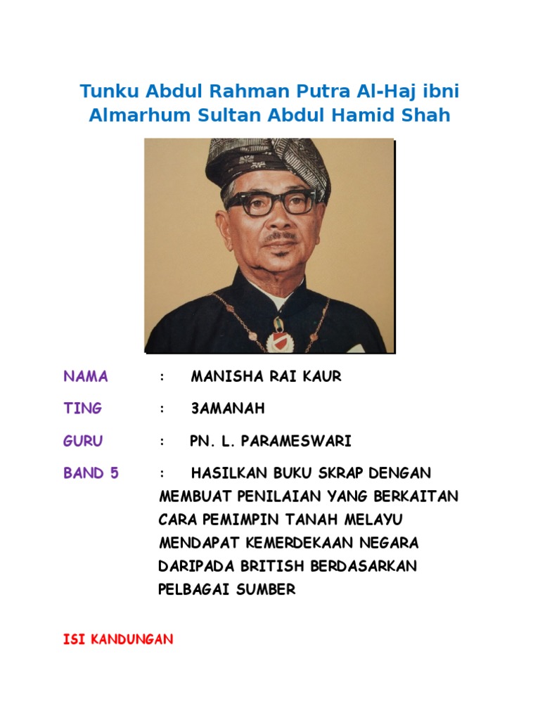 Baca versi flipbook dari TUNKU ABDUL RAHMAN PUTRA AL-HAJ IBNI ALMARHUM SULTAN ABDUL HAMID SHAH. Laungan keramat itu menjadi tanda perjuangan negara dalam menuntut kemerdekaan setelah dijajah hampir 446 tahun oleh kuasa asing Portugis Belanda. Walaupun dilahirkan dalam keluarga diraja Tunku merupakan seorang yang berjiwa rakyat.